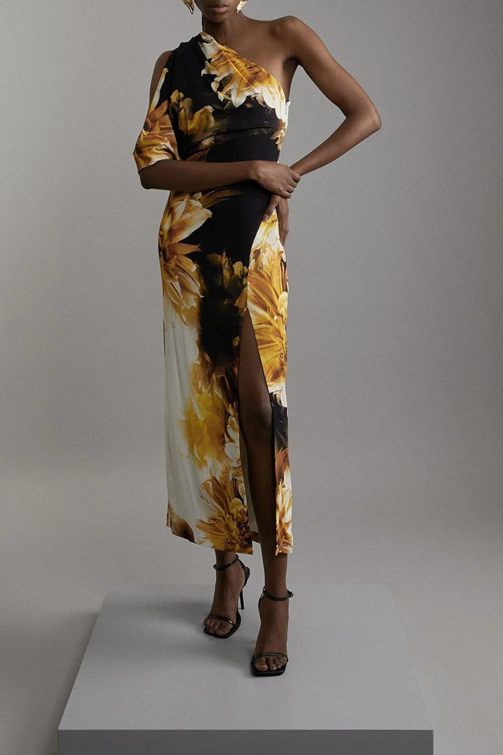 Compact Stretch Viscose Printed Photographic Floral One Shoulder Maxi Dress