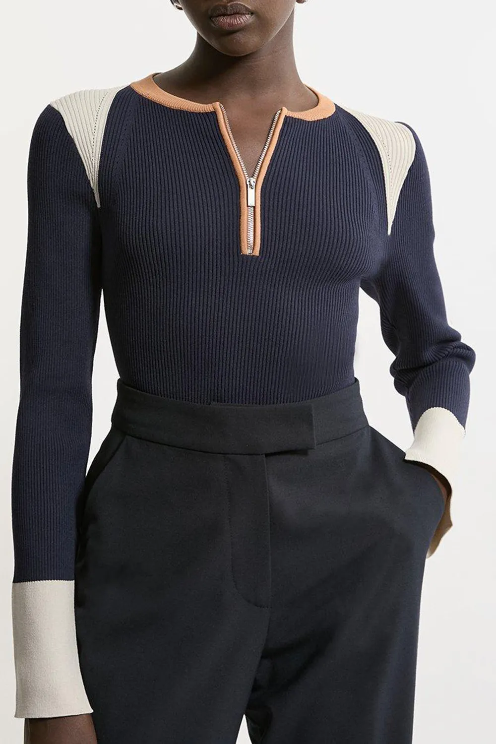 Casual Style Knit Half Zip Cuff Detail Top 414847