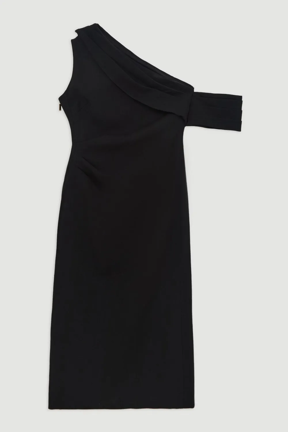 Structured Crepe Asymmetric Tailored Pencil Midi Dress