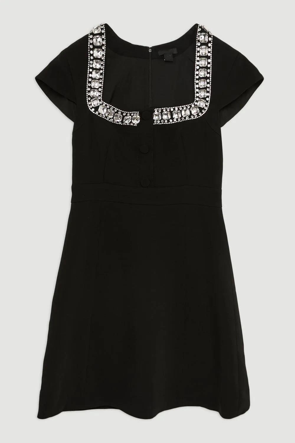 Tailored Compact Viscose Stretch Embellished Cap Sleeve Mini Dress